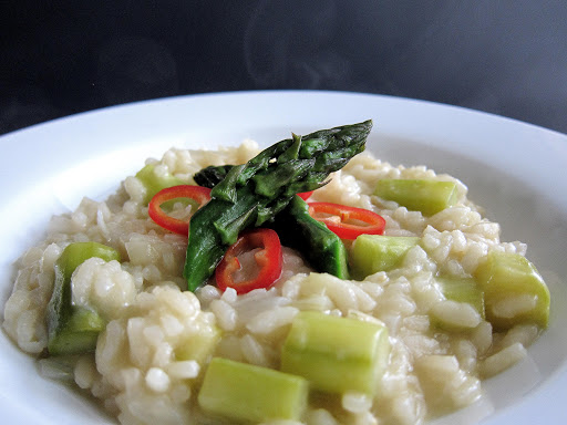 5. When the timer goes off, add remaining asparagus tips and pieces, continuing to add 1/2 cup stock as needed. Begin tasting rice at this time. You'll want it to be tender but with a bit of a crunch (it should take a total of 20 to 30 minutes to reach the right consistency). When it feels just right, stir in the asparagus puree. Remove from heat, and stir in remaining butter. Stir in salt and Parmesan too. Taste and adjust seasoning- add more salt or pepper, if needed.