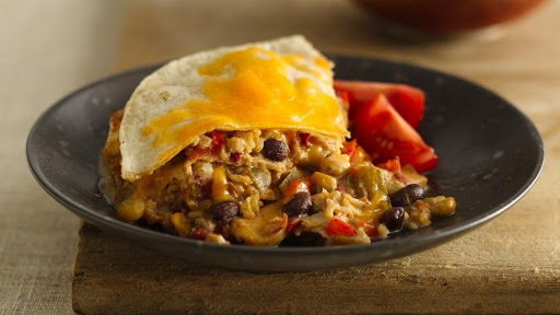 Spread 1 tablespoon of the refried beans on 1 tortilla; place, beans side up, in bottom of ungreased 1-quart casserole.