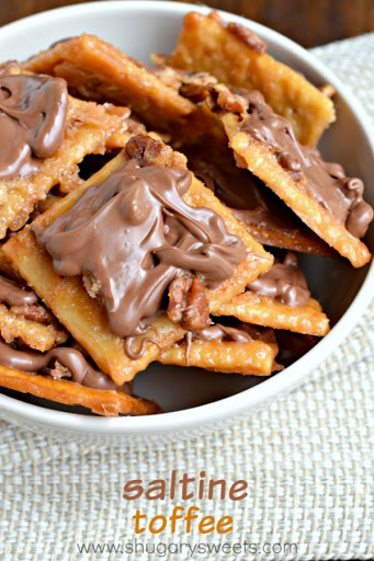 Pour over saltine crackers and sprinkle with chopped pecans (or your choice of nuts). Place in a 375°F oven for about 13-15 minutes, until crackers are browned and caramelized.