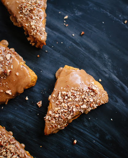 While the scones are baking, whisk together the glaze ingredients in a small bowl until smooth and creamy. Drizzle the glaze generously over the scones (I preferred mine with a solid layer across the top). While the glaze is wet, sprinkle it with the remaining chopped nuts. Enjoy!