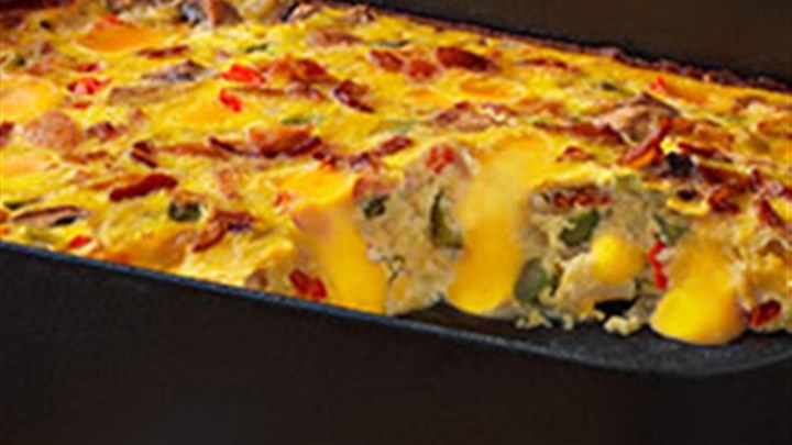 Whisk eggs and sour cream in medium bowl until blended; stir in bacon. Pour over vegetable mixture.