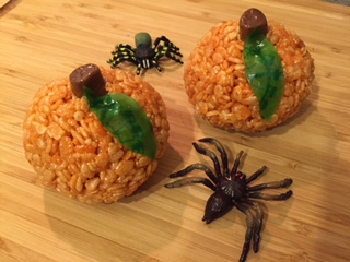 Mix in Rice Krispies. Form small balls into the shape of a pumpkin (Tip: Add Non-Stick Cooking Spray (Pam) or Crisco to your hands before forming your balls).