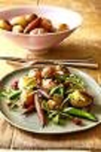 Warm a large enameled saucepan over medium heat. Add 1 ounce bacon or pancetta and 1 tablespoon butter and let cook for a few minutes before adding 2 or 3 very small onions or scallions (trimmed and left whole); 3 small carrots; 3 or 4 tiny potatoes, peeled and 3 or 4 small turnips, peeled. Season generously with salt and pepper, then stir with a wooden spoon to coat and allow the vegetables to brown lightly. Add a ½ cup water or chicken broth and cover. Let simmer briskly for 12 to 15 minutes.