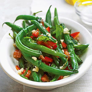 Meanwhile, in a large bowl combine basil, mint, sweet pepper, olive oil, and salt. Add drained green beans and garlic. Toss gently to combine. Makes 8 servings.