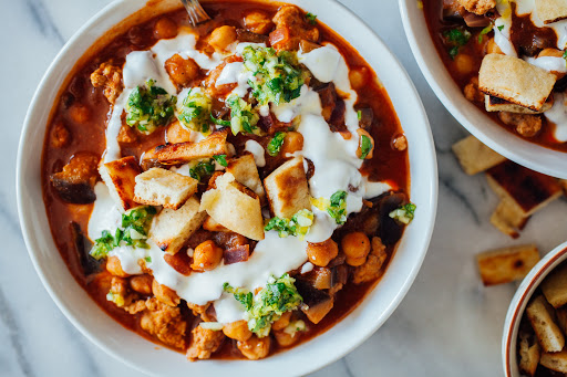 To serve, divide your chili into two bowls, drizzle with the labneh, sprinkle the chermoula on top, and scatter the pita croutons over the top. This can be made up to two days ahead and re-heated for lunch or dinner.