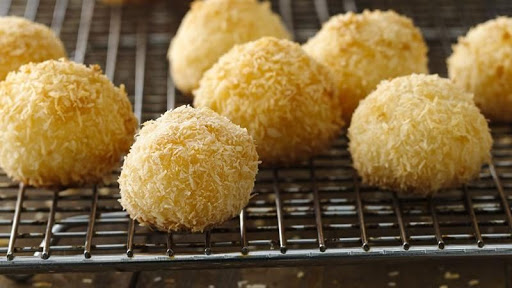 4. Place remaining 1/2 cup unsweetened coconut in shallow bowl. With moistened hands, firmly shape rounded tablespoonfuls of coconut mixture into balls; roll in unsweetened coconut to coat. Place 1 inch apart on cookie sheet.