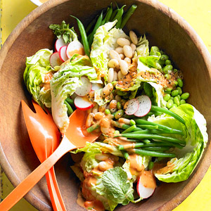 Place salad greens in a large salad bowl; add green beans, edamame, and white beans. Add about half the dressing. Sprinkle with pepper and toss gently. Pass remaining dressing. Makes 8 servings.