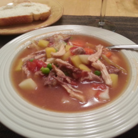 4. Add shredded beef, cabbage, tomatoes, rutabaga, 1 1/4 teaspoons salt, and 1 teaspoon pepper and bring to a boil. Reduce heat to medium-low and simmer until rutabaga is translucent around the edges, about 15 minutes. Stir in potatoes and carrots and cook until all vegetables are tender, about 20 minutes. Add chicken and peas and simmer until heated through, about 2 to 3 minutes. Off heat, stir in lemon juice. Season with salt and pepper to taste. Serve. Enjoy!!