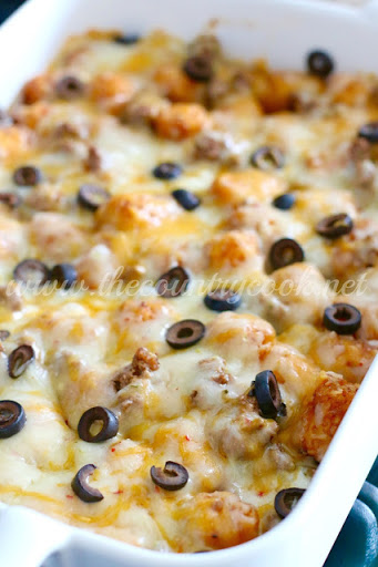 Sprinkle cheese all over tater tot mixture. Top with sliced black olives.