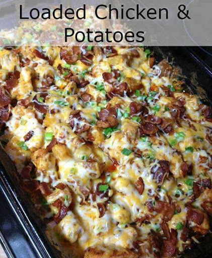 4. Once the potatoes and chicken are fully cooked, remove from the oven. Top the cooked potatoes with the the cheese, bacon, and green onion. Return the casserole to the oven and bake for 5 minutes or until cheese is melted.