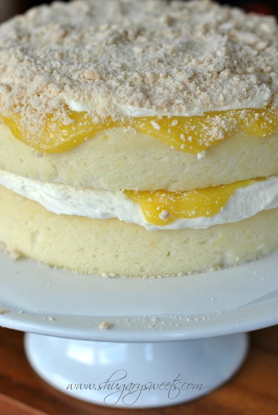 To assemble cake. Lay first layer of cake on a cake stand. Top with all but 1/2 cup of cream cheese filling. Add 1/2 cup lemon curd and 1/2 cup dry cake topping. Top with second layer of cake. Spread remaining 1/2 cup lemon curd on top and remaining 1/2 cup cream cheese filling. Sprinkle the crumb topping over the entire top of the cake. Refrigerate at least two hours.