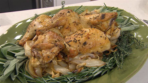 Cut the chicken into pieces or carve the meat off the bone, giving each person some of the crispy, salty skin. Spoon some of the pan juices over the chicken and serve with onions on the side.