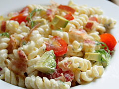 Add tomatoes, avocado and bacon to pasta; toss gently to combine. Add dressing; toss to coat. Serve immediately. To serve chilled, do not add dressing. Cover and refrigerate pasta mixture. Remove from refrigerator 15 minutes before serving; toss with dressing.