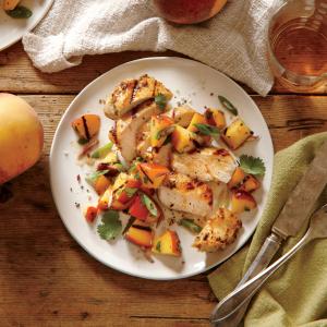 4. Recoat pan with cooking spray. Add peaches; grill 3 minutes, turning once to mark the cut sides. Transfer peaches to a cutting board; coarsely chop. Transfer peaches and their juices to a large bowl. Add remaining 1 teaspoon spice mixture, remaining 2 tablespoons lime juice, remaining 2 teaspoons honey, remaining 1/4 teaspoon salt, remaining 1/4 teaspoon pepper, cilantro, olive oil, and scallions. Serve chicken with salsa and lime wedges, if desired.
