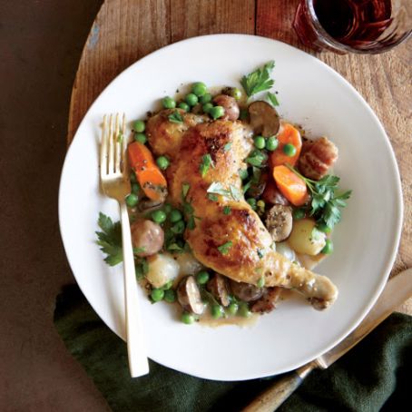 Pancetta lardons lend rich flavor to this simple French stew. For convenience you can prepare the stew ahead, leaving out the green peas; then add the peas for the last 2 minutes of reheating to preserve their texture and color.