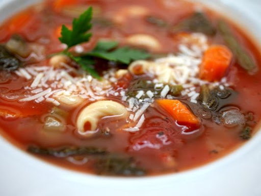 In a large slow cooker, combine whole tomatoes with juices (crushing each tomato by hand), tomato paste, broth, cannellini beans, onion, carrots, celery, green beans, garlic, red pepper flakes, if using, 1 teaspoon oregano, 1 teaspoon basil and 1/2 teaspoon thyme. Set cooker on high and cook soup for 4 hours (or low 6-8 hrs). Prepare macaroni according to package directions, omitting the salt. Add cooked pasta, remaining oregano, basil and thyme and cook an additional 30 minutes. Add vinegar when cooking time is complete and stir in the spinach. Each serving consists of 1 cup soup, garnished with 1 tablespoon grated Parmesan cheese.