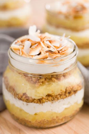 Among four mason jars, layer graham cracker crust, pineapple (using a spoon), and cream, alternating until you reach the top of the jar.