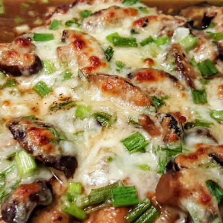 6. Preheat oven to 450 degrees. Lightly grease a 13 x 9 baking pan. Add the chicken to the prepared baking pan. Sprinkle evenly with the mushrooms.