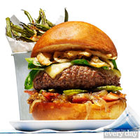 Spoon lots of bacon jam on the bun bottoms; top with the sliced cornichons. Add the patties and top with the salad, some fried onions and the bun tops. Serve the burgers with the Haricots Frites.