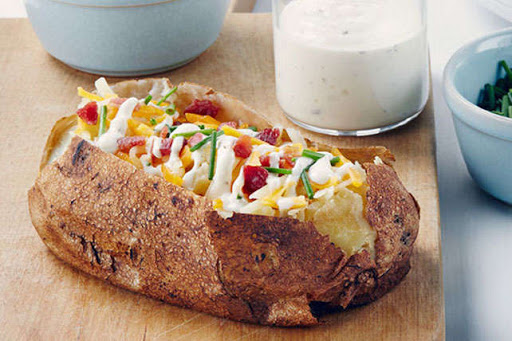 Unwrap potatoes carefully; cut slits in potatoes. Serve topped with remaining ingredients.
