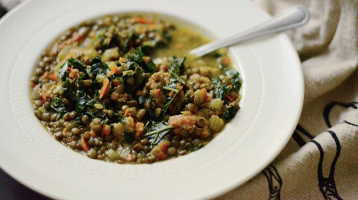 Put the remaining 2 Tbs of olive oil in the pot and add the vegetables. Sauté this mix for about 10 minutes until the vegetables become soft and transparent. Add the thyme, bay leaves, lentils and 6 cups of water. Season with salt and pepper, bring to a simmer and cook for 25 – 30 minutes until the lentils are done. Add the vinegar, kale, sausage and any more water to achieve the consistency you want. Cook for 5 more minutes to reheat the kale and sausage.