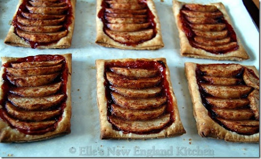 Top with sliced apples. Brush the outside border with the egg and sprinkle with sugar. Transfer to greased baking sheets and bake for 23-25 minutes, turning halfway through. The tarts should be golden brown.