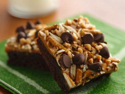 Meanwhile, in medium microwaveable bowl, microwave caramels, butter, and milk uncovered on High 2 to 3 minutes, stirring once, until caramels are melted. Carefully pour and spread over warm brownies. Sprinkle with pretzels, remaining 1/2 cup chocolate chips and toffee bits. Cool completely.