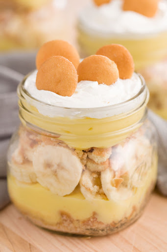 Among four mason jars, layer crushed Nilla Wafers, vanilla pudding, and bananas, alternating until you reach the top of the jar.