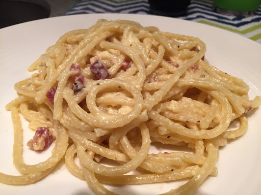 NOTE:Whatever you do, work fast or the pasta will get cold and the eggs will stay raw and runny. Ideally the heat of the pasta will cook the egg just enough, and the sauce should be creamy.