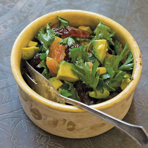 In a bowl, combine dried apricots, dried Medjool dates, extra-virgin olive oil, fine sea salt, preserved lemon and parsley leaves. Toss well. Add avocado, gently toss and serve.