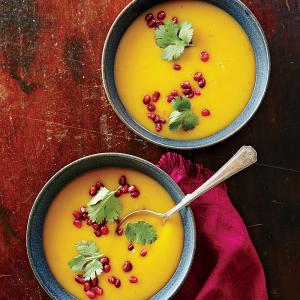 3. Place half of squash mixture in a blender. Remove center piece of blender lid (to allow steam to escape); secure blender lid on blender. Place a clean towel over opening in blender lid (to avoid splatters). Blend until smooth. Pour into a large bowl. Repeat procedure with remaining squash mixture. Stir in vinegar and red pepper. Ladle soup into shallow bowls. Top evenly with pomegranate and cilantro.