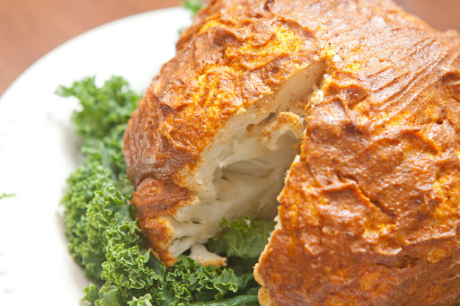 4. Remove the cauliflower from the oven and increase the oven temperature to 450°F. Remove the foil from the cauliflower and spread with the coating of choice. Return it to the oven to brown, 10 to 15 minutes.