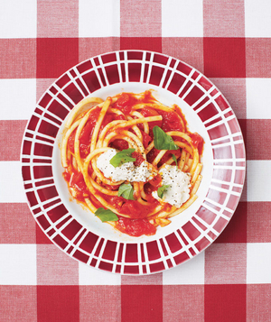 Add the marinara to the pasta and toss to coat. Dollop with the ricotta and sprinkle with the basil. Top with additional black pepper.