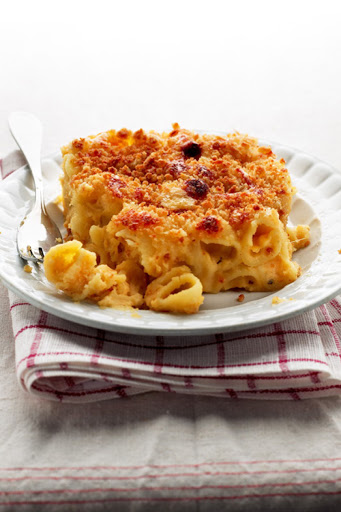 cheddar, half the Gruyère, the Velveeta, and the blue cheese; continue stirring until smooth. Stir in pasta and season sauce with salt and pepper. Transfer mixture to an 8" x 8" baking dish. Sprinkle remaining Gruyère over top of pasta and then top with bread crumbs.
