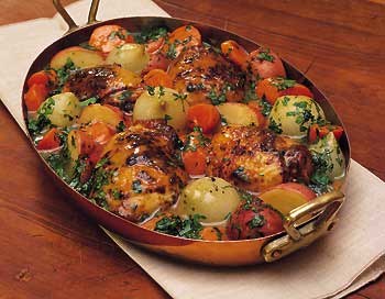 To make a more classic version of this chicken dish substitute a hearty red wine, such as Burgundy, Beaujolais or Chianti, for the white wine. Add 1/2 pound tiny mushrooms to the skillet when the carrots are added and stir 1/2 tablespoon tomato paste into the carrot mixture just before the chicken goes into the oven.