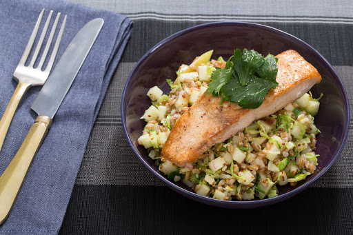 While the salmon cooks, to the bowl of cooked Brussels sprouts, add the apple, cooked farro and as much of the vinaigrette as you’d like (you may have extra vinaigrette). Stir to thoroughly combine and season with salt and pepper to taste. In a small bowl, toss the parsley with the juice of the remaining lemon wedge; season with salt and pepper to taste. Divide the farro salad between 2 dishes. Top with the cooked salmon and garnish with the dressed parsley. Enjoy!