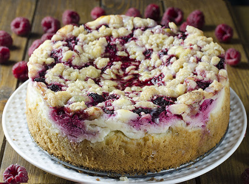 4.With an electric mixer cream together the butter and sugar on medium-low speed. Add egg and egg yolk and vanilla. Slowly mix in the flour mixture alternating with the sour cream. Transfer the batter into the prepared pan and smooth with a spatula. Spread the cream cheese filling on top. Place raspberries onto cream cheese filling.