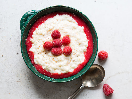 Just before serving, whip heavy cream. Fold cream into pudding and transfer into bowls. Spoon raspberry sauce around edge of pudding and sprinkle with nutmeg.