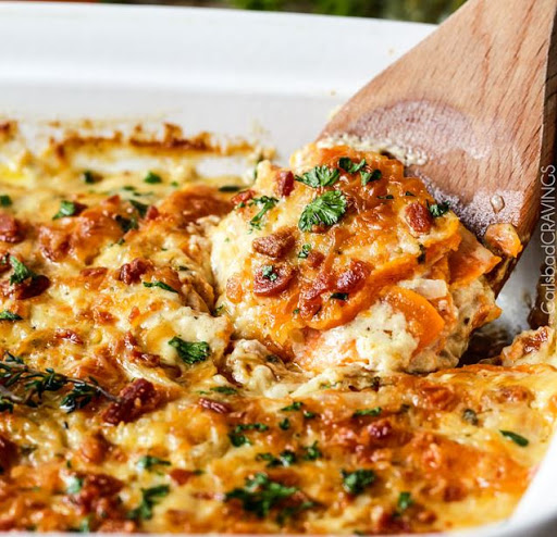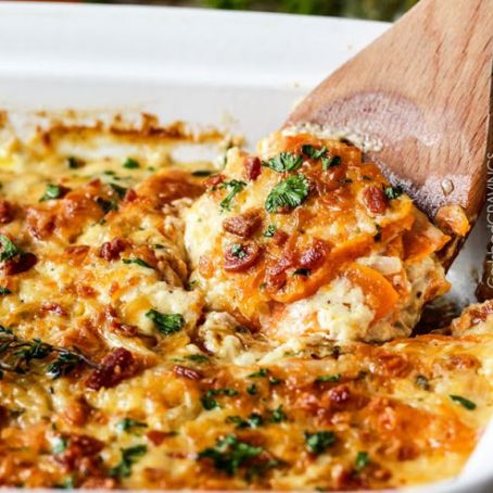 Herb Scalloped Sweet Potatoes & Bacon Au Gratin
