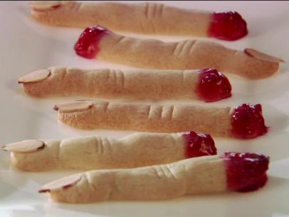 Using about1 1/2 tablespoons of dough at a time, roll the dough between your palms into 5-inch-long fingers about 1/2-inch thick. Firmly press a sliced almond into the end of each finger to make fingernails. Make several horizontal cuts, about 1/4 inch deep and 1/2 inch long, in the center of each finger to make knuckles. Press the dough on either side of the cuts to shape the knuckles. Arrange the fingers on the prepared baking sheet and bake until light golden, 16 to 18 minutes. Transfer the fingers to a wire rack and cool completely.