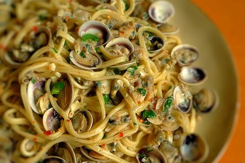 Toss in the clams, white wine, and the squeeze of lemon and cover with a tight lid. The clams should open up in about 6-8 minutes. Discard any clams that have not opened. There should be enough liquid from the clams themselves and the white wine for the sauce, but you can add a touch of pasta water or a little more white wine if you need more liquid.