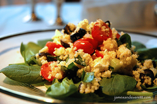 Whisk together olive oil and lemon juice in a small mixing bowl. Add garlic paste, herbs, and salt and pepper. Mix well. Pour over couscous mixture and toss until evenly coated.