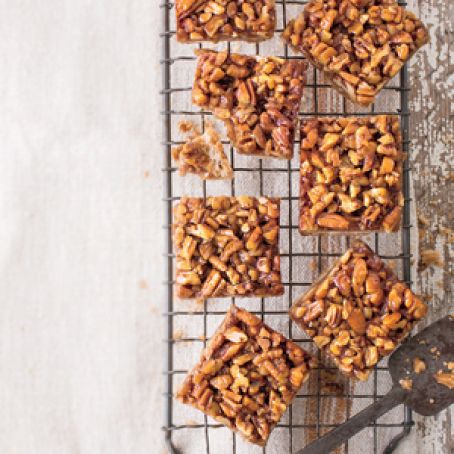1. Prepare Crust: Preheat oven to 350°. Pulse flour and next 3 ingredients in a food processor 8 to 10 times or until thoroughly combined and pecans are finely chopped; add butter, and pulse 8 or 9 times or until mixture resembles coarse meal. Line bottom and sides of a 13- x 9-inch pan with aluminum foil, allowing 2 to 3 inches to extend over sides; lightly grease foil with cooking spray. Press mixture onto bottom of prepared pan.