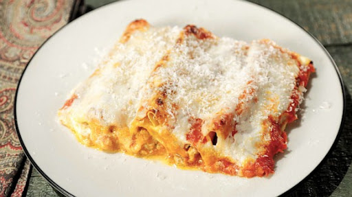 In a 9inch x 13inch casserole dish, spread half of the Basic Tomato Sauce across the bottom in an even layer. Carefully lay each cannelloni in the casserole in two rows of 6. Top with the remaining Basic Tomato Sauce, then the Besciamella Sauce. Finish with 1/4 cup Parmigiano-Reggiano. Bake for 20 to 25 minutes, until the sauces and cheese are bubbling and the edges of the pasta are crispy and browned. Serve with more Parmigiano-Reggiano and nutmeg freshly grated over the top.