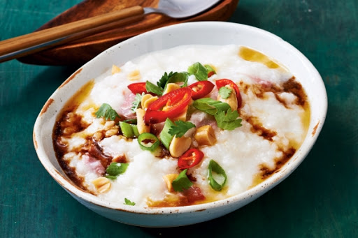 Congee is a savoury rice porridge that can be enjoyed any time of day. Smoked ham hock adds a unique depth of flavour to this Asian staple. Look for it near the cured meat section of your grocery store.To serve, place individual bowls of garnishes, such as sodium-reduced soy sauce, sesame oil, salted Virginai peanuts, sliced green onions, chopped cilantro, and sliced hot chiles, at the table and let everyone dress their own bowl to suit their tastes