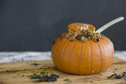 Chili is an Fall staple in most households. Why not spruce it up a bit for the Halloween season by switching out the con carne for some protein packed quinoa and put away the slow cooker in replacement for this season's best gourd! Chili in a pumpkin is appealing for the eyes and your taste buds!