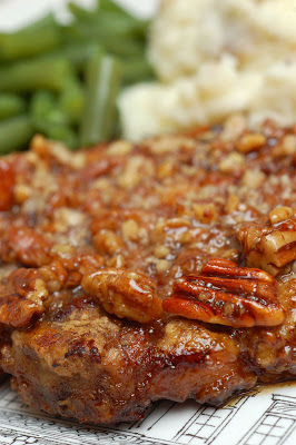 Melt butter in large heavy skillet over medium-high heat; brown cutlets on one side, turn; stir together honey and pecans and add to skillet, stir gently. Cover and simmer for 7-8 minutes.