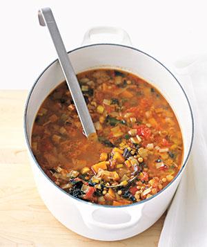 Add 6 cups water and bring to a boil. Stir in the sweet potatoes, kale, lentils, thyme, 1 ½ teaspoons salt, and ¼ teaspoon pepper. Simmer until the lentils are tender, 25 to 30 minutes.