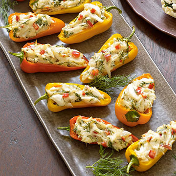 Heat oven to 300 degrees . Combine crabmeat, mayonnaise, red pepper, Dijon mustard, dill, olive oil, salt and pepper. Slice sweet peppers in half horizontally and fill with crab mixture. Place on a baking sheet and bake at 300 degrees for 15 minutes. Garnish with additional fresh dill, if desired.