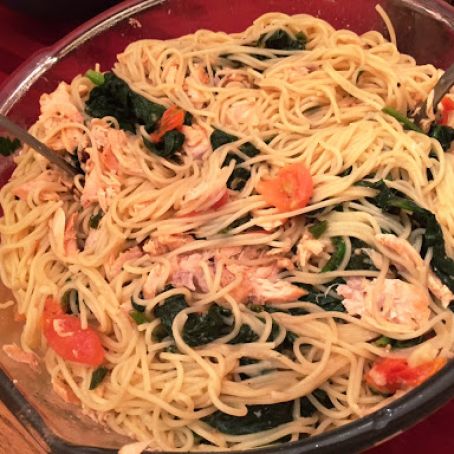 7. Combine pasta, sauce and salmon in large bowl or serving platter;